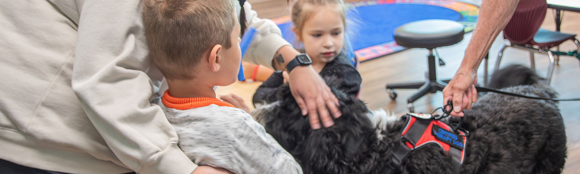 On Thursday, October 3, our therapy dog Archie paid a special visit to the children in the Ready Program at the Rehabilitation Services and Medical Office Building. His arrival brought excitement to the room. Some of the children were thrilled to have a visitor. This visit to the Ready Program marks an important step in expanding the therapy dogs' presence to more departments throughout the hospital.